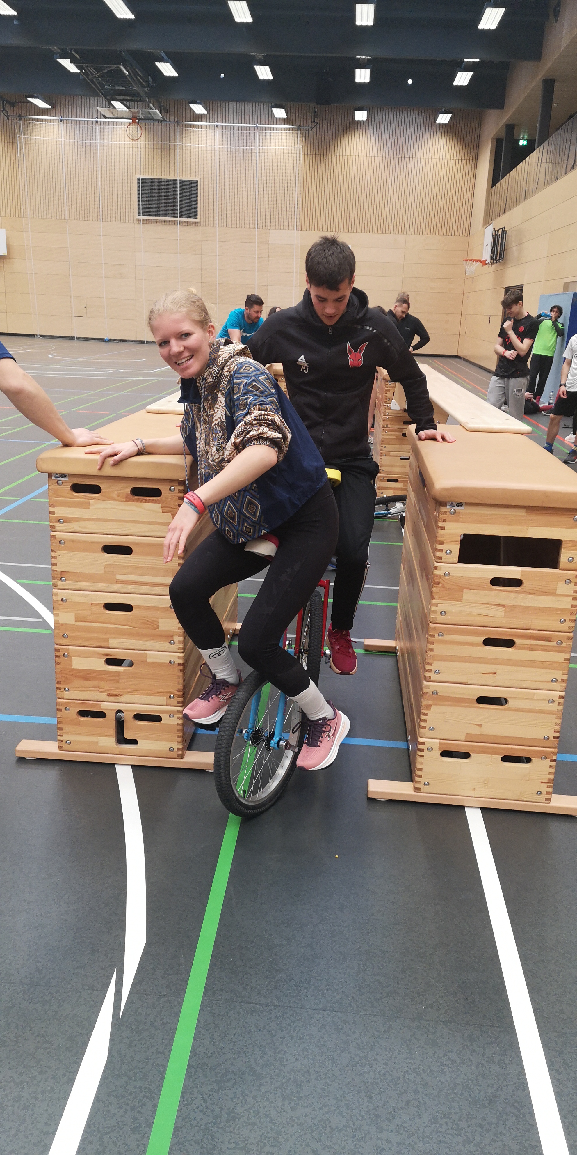 Im Lernbereich Bewegungskünste und Akrobatik beurteilten und erprobten „die Sportler“ - gewissermaßen im Selbstversuch – das Einrad Fahren. Schnell erfährt (!) man, welche Lernschwierigkeiten auftreten und wie man Schüler methodisch bei dieser echten sportlichen Aufgabe unterstützen und motivieren muss.