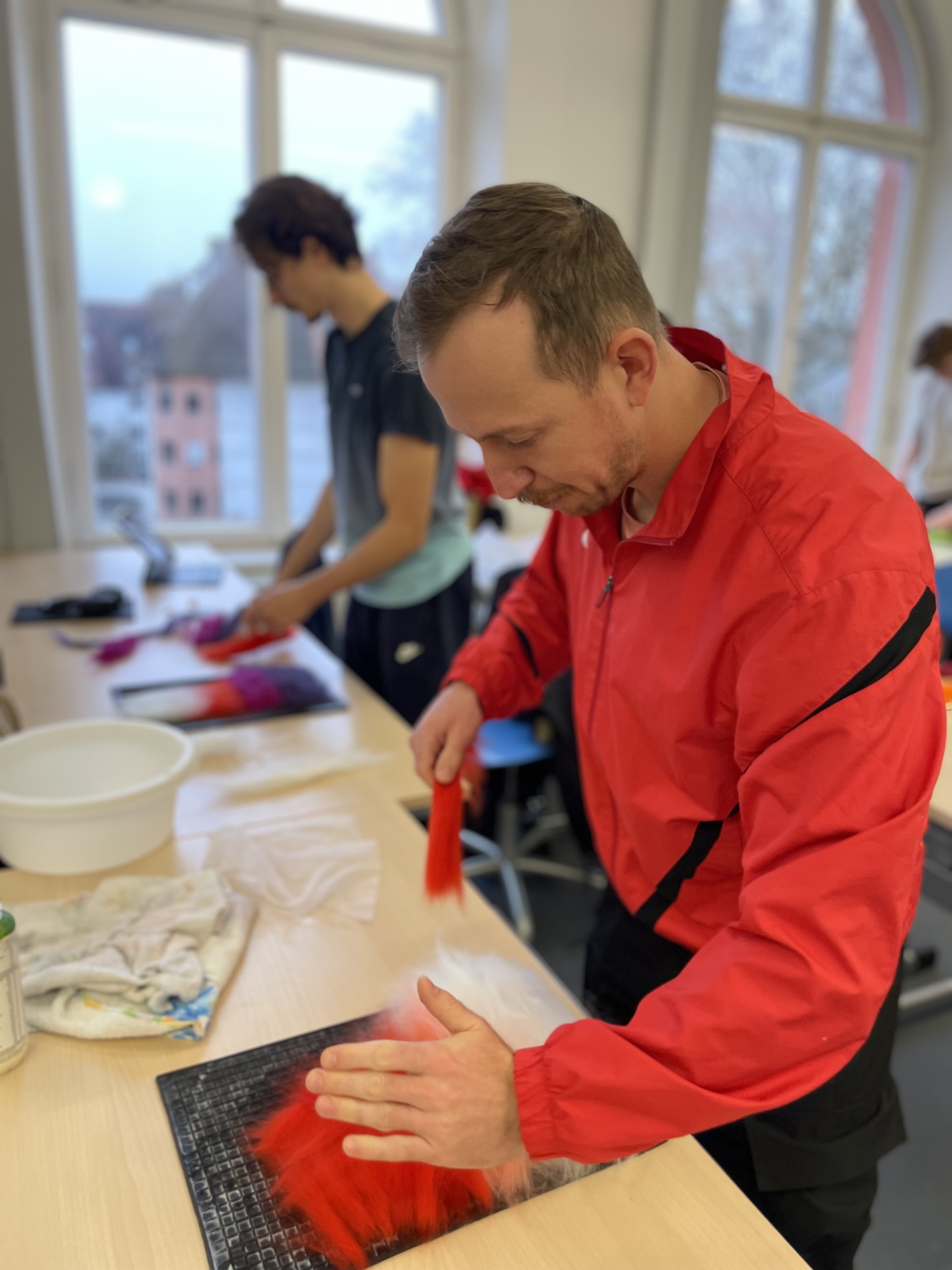 Anlässlich des bevorstehenden Nikolaustags filzten die Studierenden im Unterricht farbenfrohe Stiefel aus Wolle – jedes Stück ein individuelles Unikat.